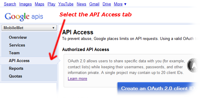 Visit the following URL to access the Google APIs console:
