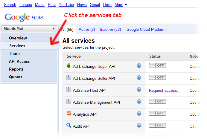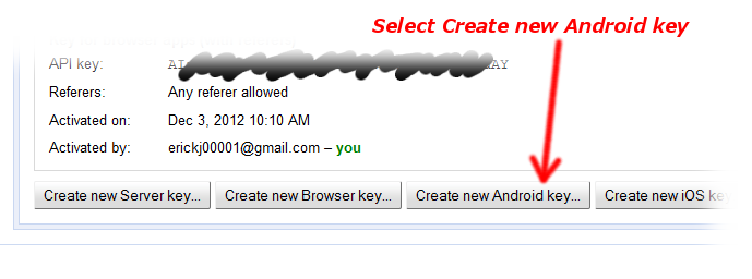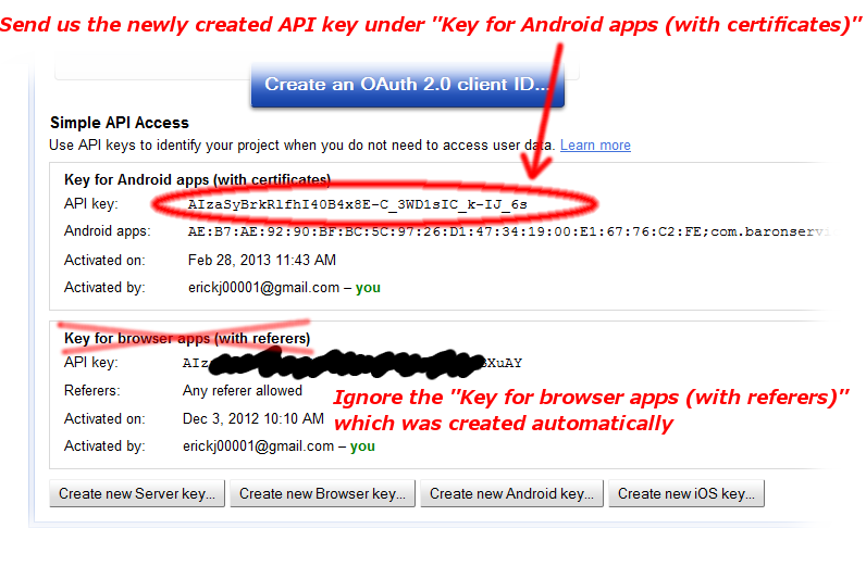 It will prompt you to create a new project if you have not already, and will then display the console. The screenshots below show you how to enable Google Maps Android v2, and how to generate an API key to send back to us.