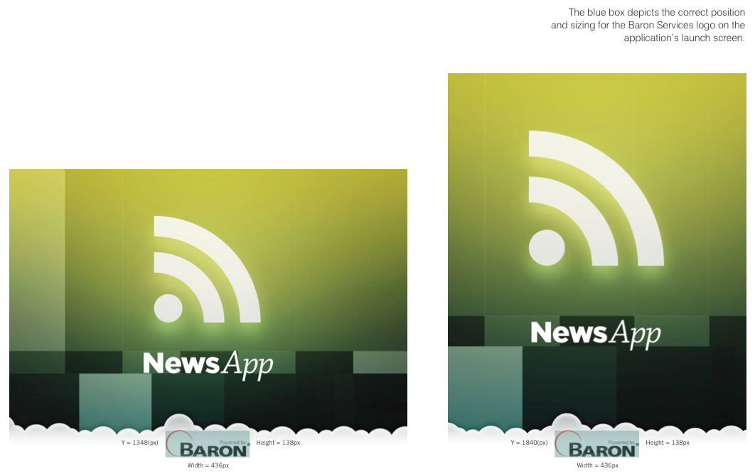 You must create your own launch screen for the app, which must include the Baron Services logo (specifically, the “Powered By” variation that we have provided) at the lower center of the screen. Our logo must have a width of 436 pixels and a height of 138 pixels at xhdpi resolution. The top of the logo should line up with the 1840th vertical pixel on the portrait orientation and the 1348th pixel on the landscape orientation (at xhdpi resolution), and be centered horizontally. The logos must maintain their transparency and may not be overlaid onto a solid background.